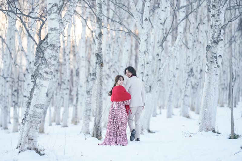 白樺の並木道での撮影は北海道らしさ溢れる素敵な一枚です