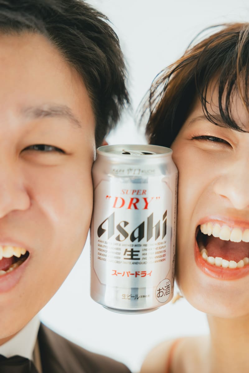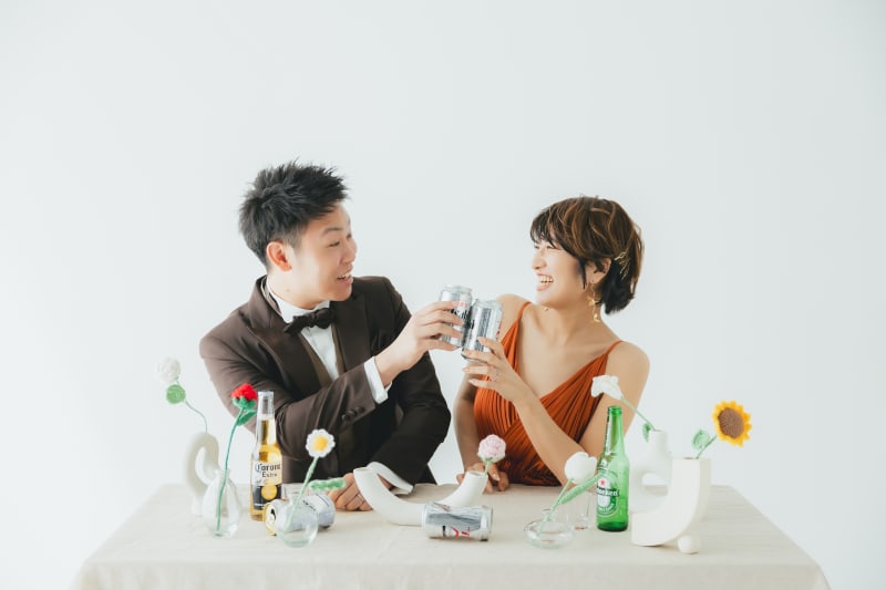 お二人は、お酒が共通の趣味で出会ったという、笑顔がとても素敵な新郎新婦様です。初めてご来店いただいた際に撮影体験で私が撮影させていただき、その体験がきっかけで今回の撮影を全てお任せいただくきっかけとなりました。
