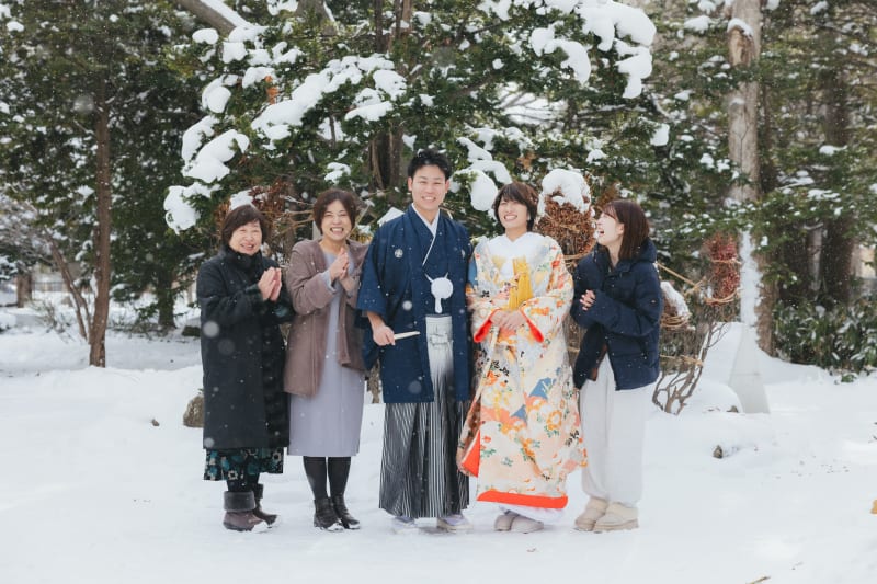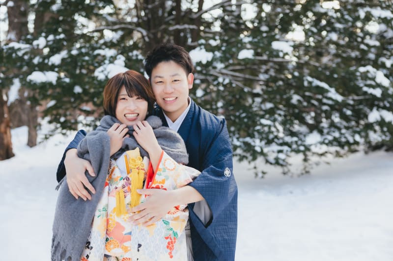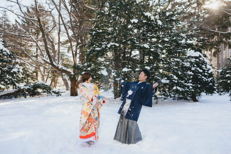 撮影当日は雪が舞い散る中、歴史ある旧永山邸でのロケーションフォトからスタートしました。降り積もる雪がロマンチックな雰囲気を演出し、お二人の笑顔が白銀の世界に映える素晴らしい瞬間をキャッチすることができました。