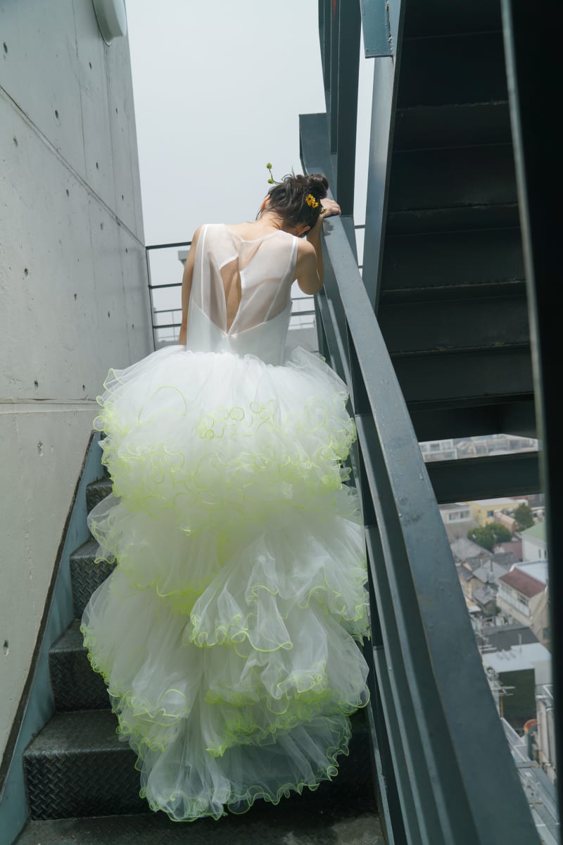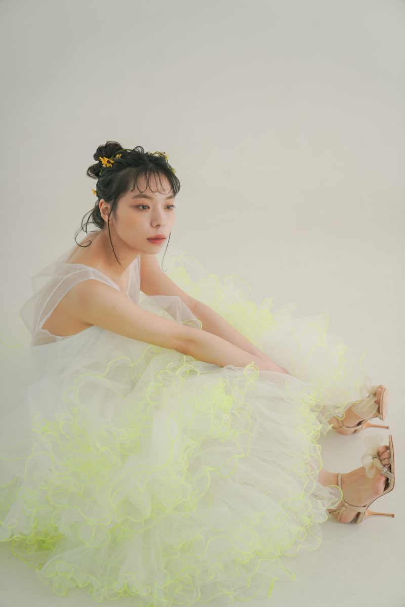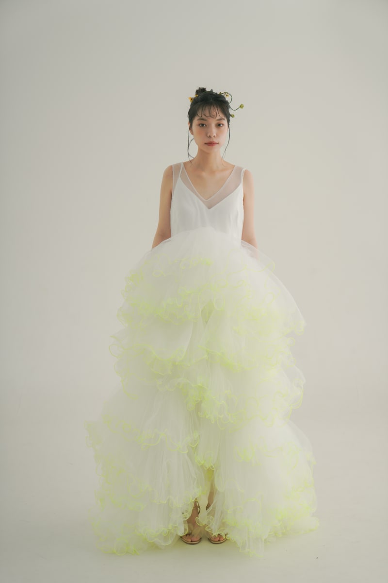 約2年前にリリースしましたDésir(デジール)が大変好評だったため、さらにボリュームアップさせ蛍光イエローの色味がアクセントになり、遊び心溢れる1着になります。足元が見える丈にしているためコーディネートも楽しめるドレスです。