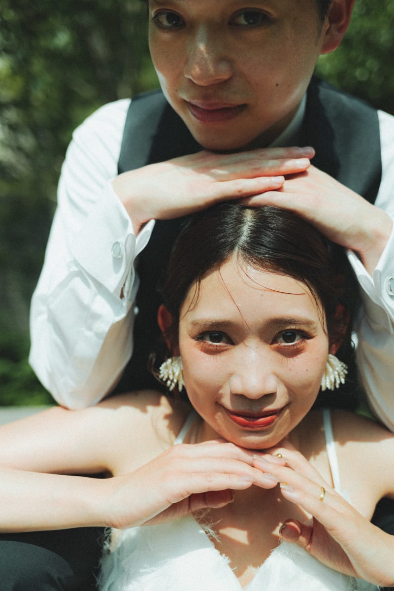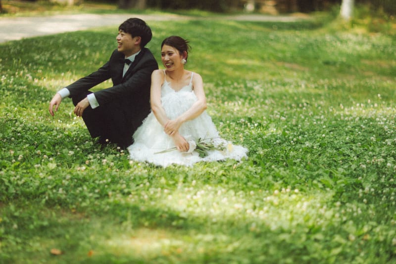 緑豊かな芝生に座って、リラックスした笑顔のお二人。自然体でいられる瞬間が、一番美しい思い出になります。