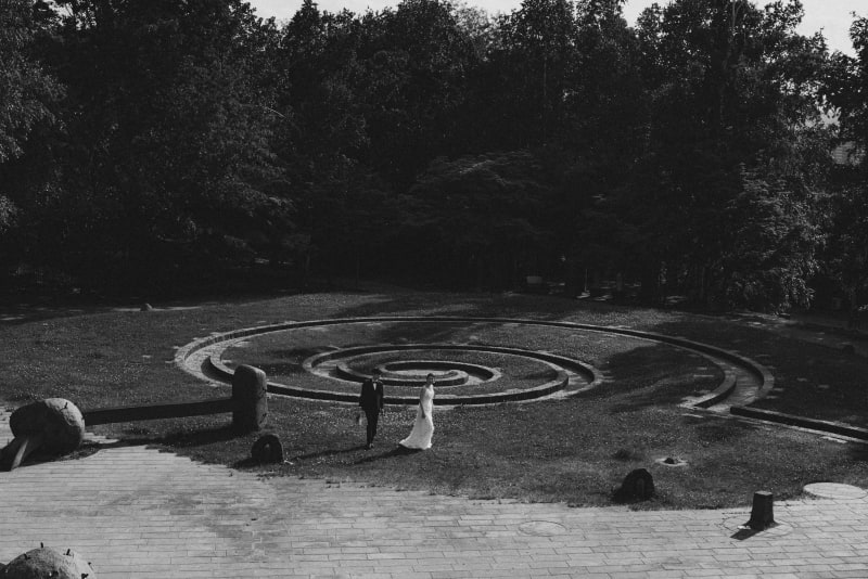 - まるで古代の遺跡のような『スパイラルスプリング』を背景に。広大な敷地ならではのダイナミックな構図が、二人の門出を祝福しているようです。