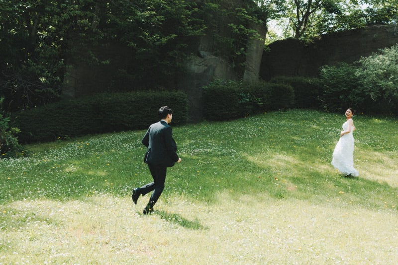広々とした芝生で、無邪気に駆け出す新郎を、優しい笑顔で見つめる新婦。自然体のお二人の姿がとってもキュート!