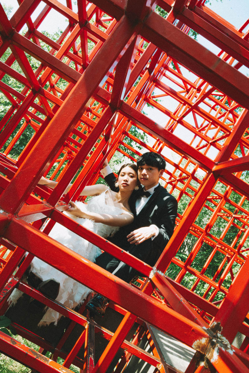 石山緑地のシンボルの一つ、赤い幾何学的なオブジェ『赤い空の箱』での一枚。二人の視線が交錯する瞬間は、まるで現代アートのよう。ここでの撮影は、他にはない特別な思い出になりますね。