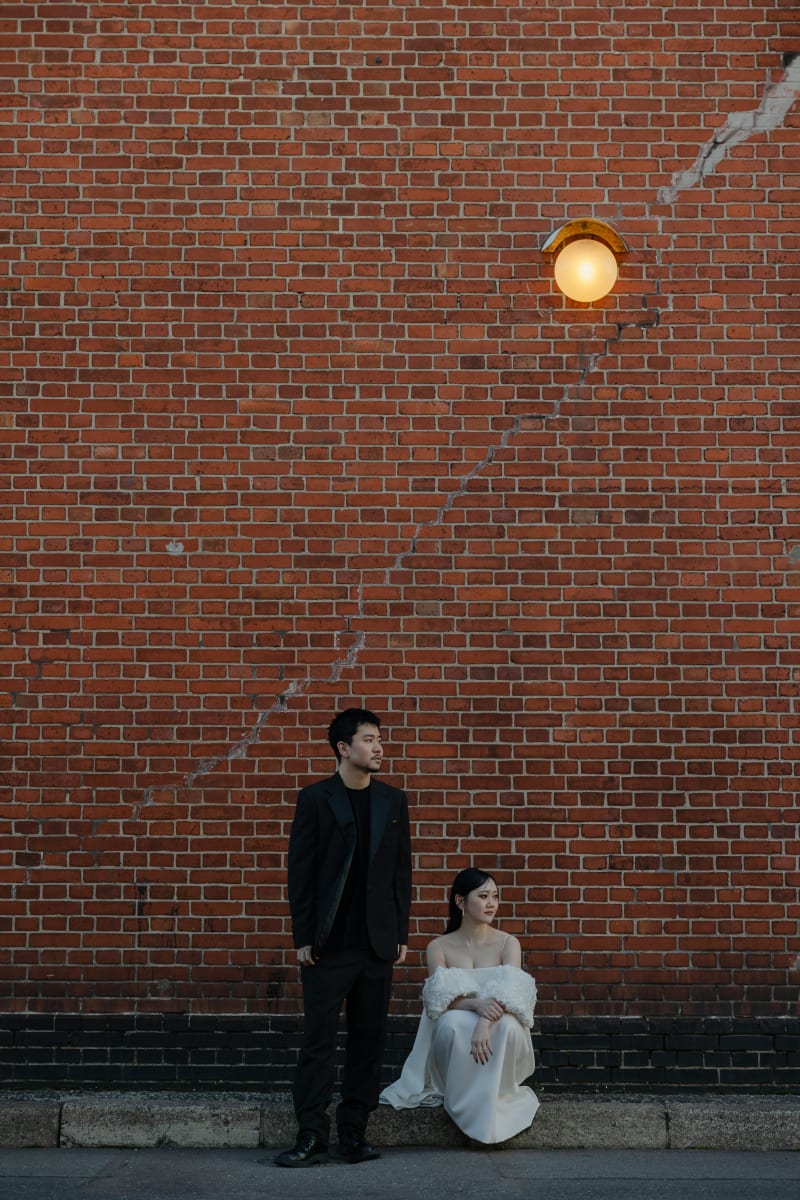 ポーズをシンプルにすることで、レンガ調の建物をより引き立たせクールな写真に