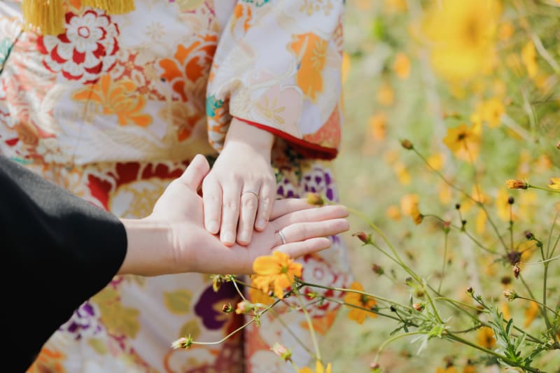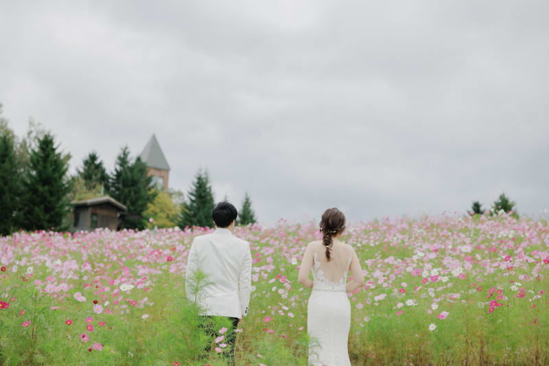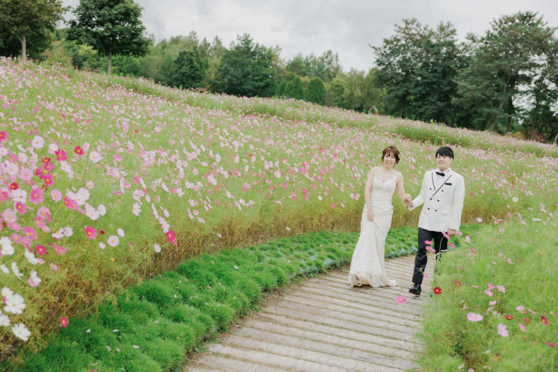 秋のほんの短い間だけしか楽しめない、コスモスでのウェディングフォト。