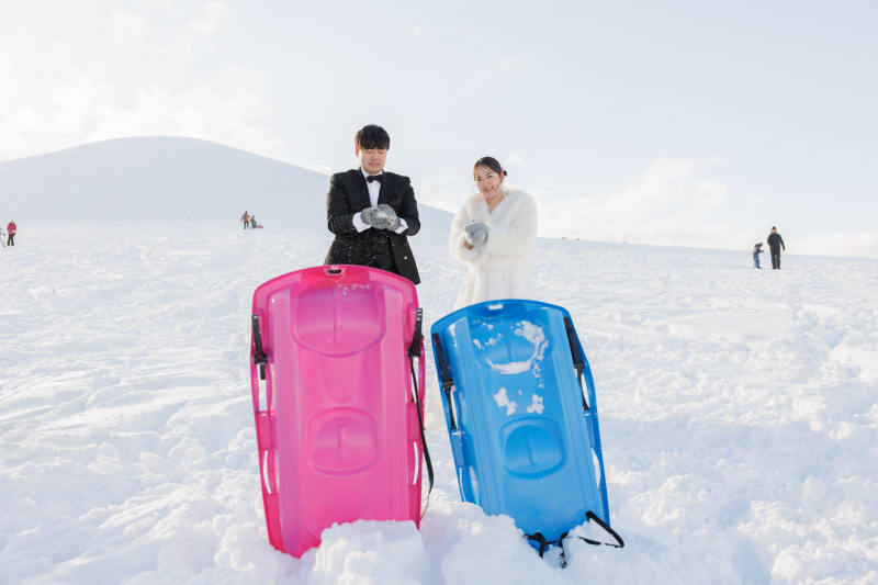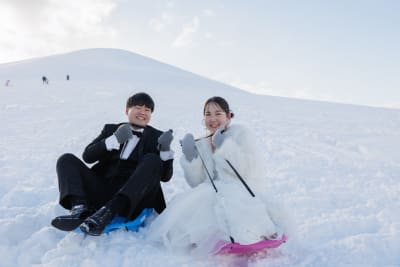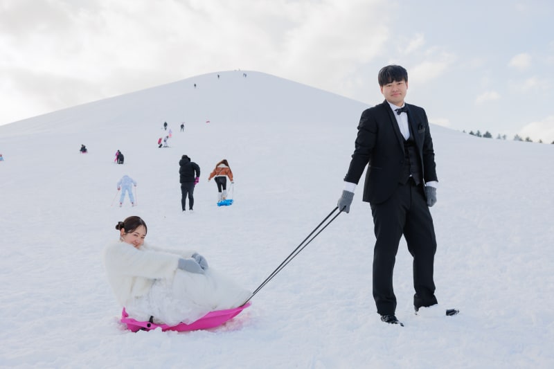今回の写真はそり滑りをしながらのウェディングフォトで、ワイワイ楽しみながら撮影したものになります🛷