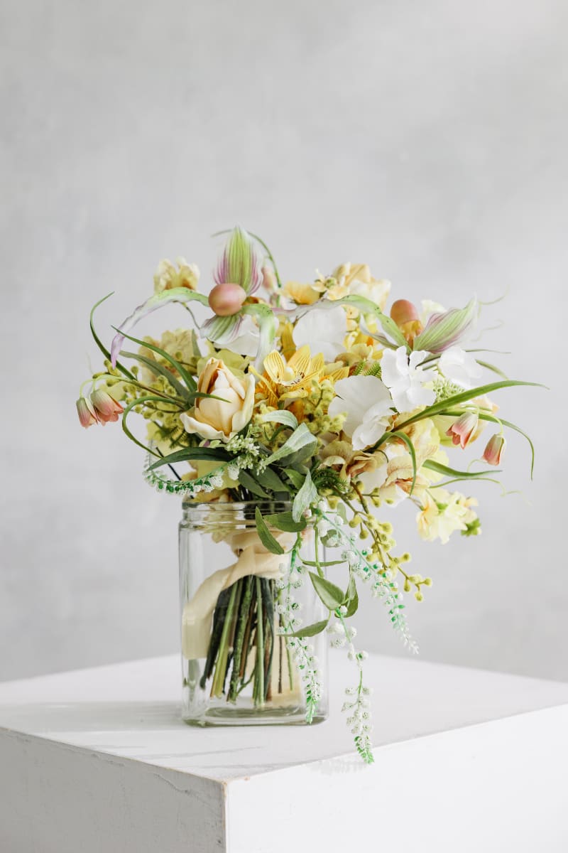 明るい花々が幸せの瞬間を包み込み、花嫁に温もりを与えてくれるブーケになっています。