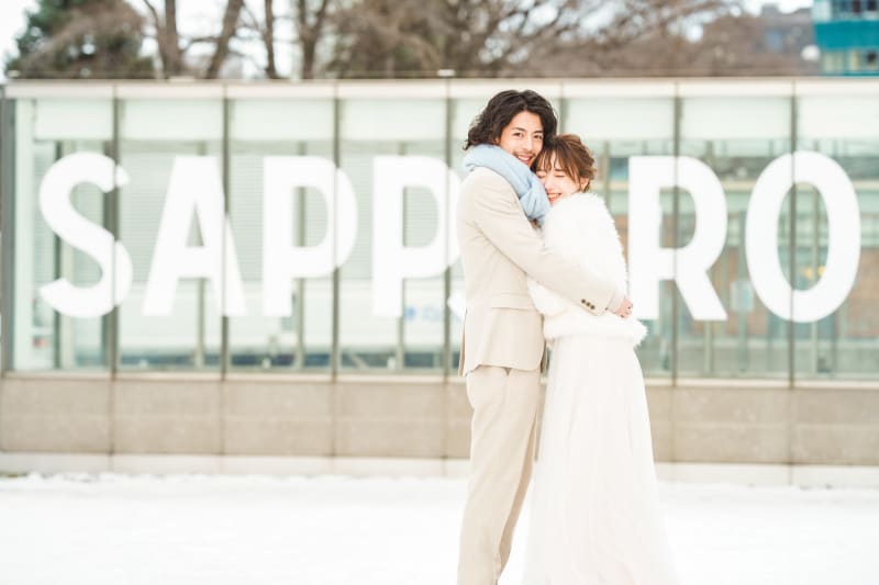 こちらのお写真も、プランにはない「大通公園」でのロケーション撮影です♫雪景色と背景の「SAPPORO」が北海道らしいですね✨