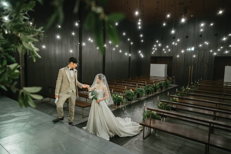 チャペルに合わせてシックに、ところどころナチュラルな雰囲気も交えたいとの希望でキリッとしたショットから笑顔ショットまでさまざまな写真を残しました!
