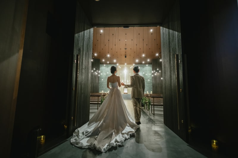 チャペル内ではベールやドレスの長いトレーンを活かし、神聖な雰囲気で。