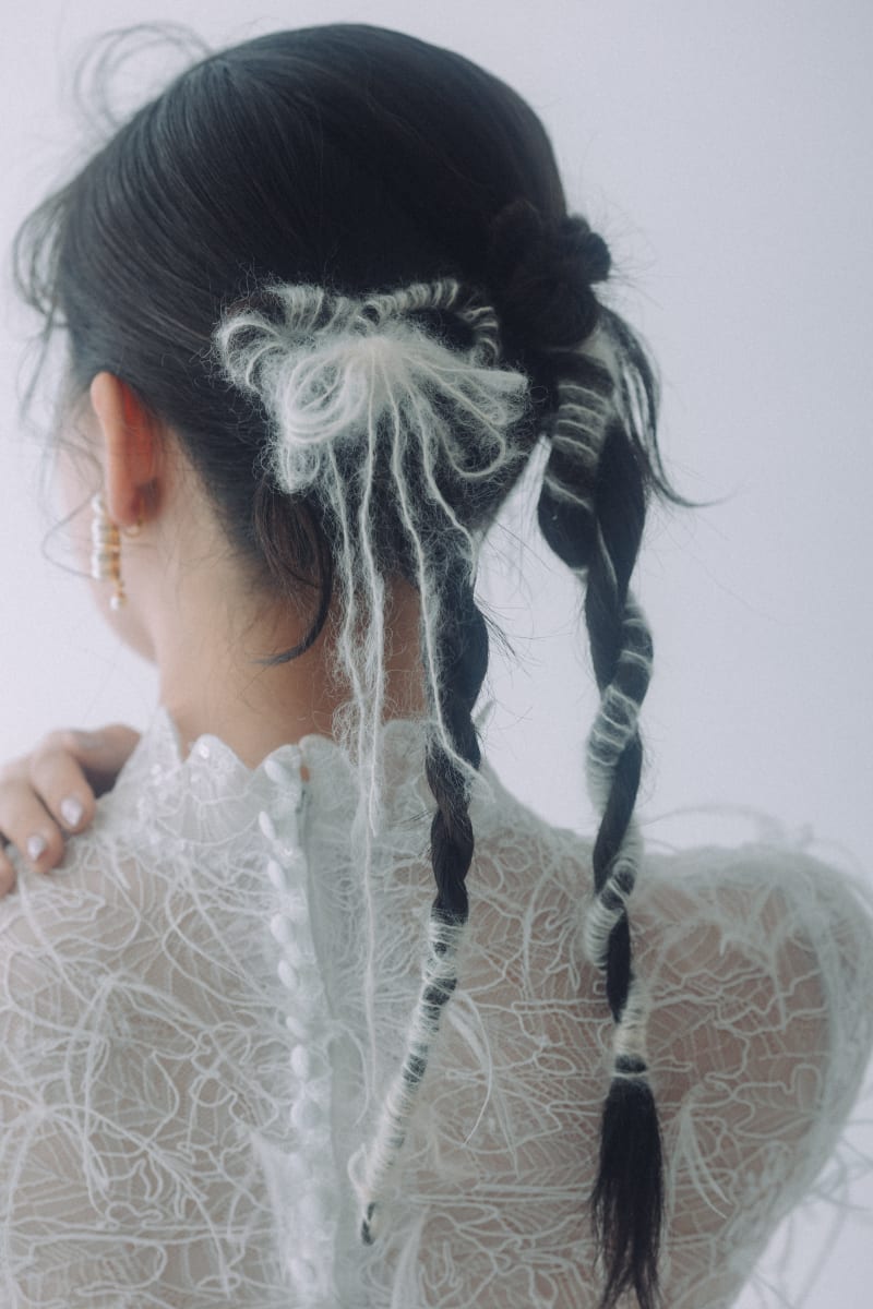 ヘアアクセは、統一感が出るようにふわふわの毛糸を巻き付けて可愛いけれど可愛すぎない。そんなスタイルに仕上げました。