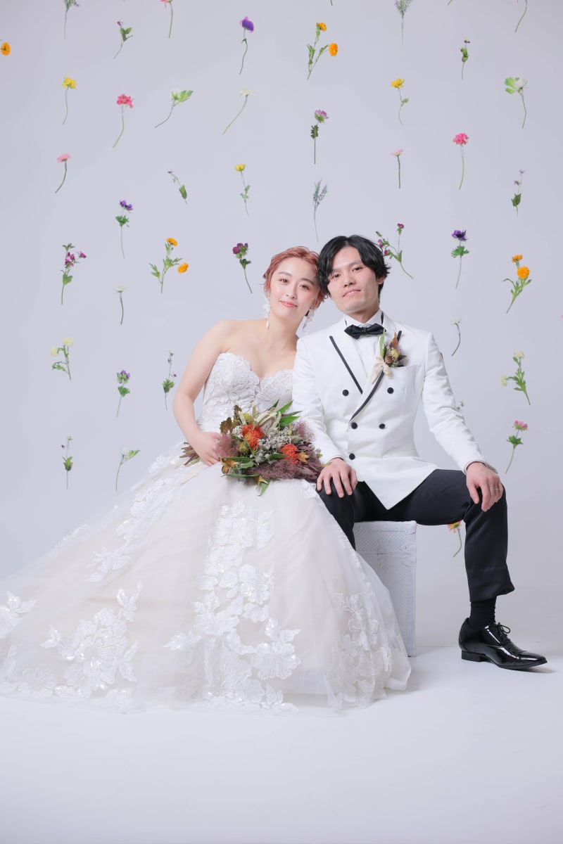 カラフルな花々が詰まったボックス背景で、シンプルながらも華やかなアクセントになります。小物のお持ち込みも可能で、個性的な演出が楽しめます。