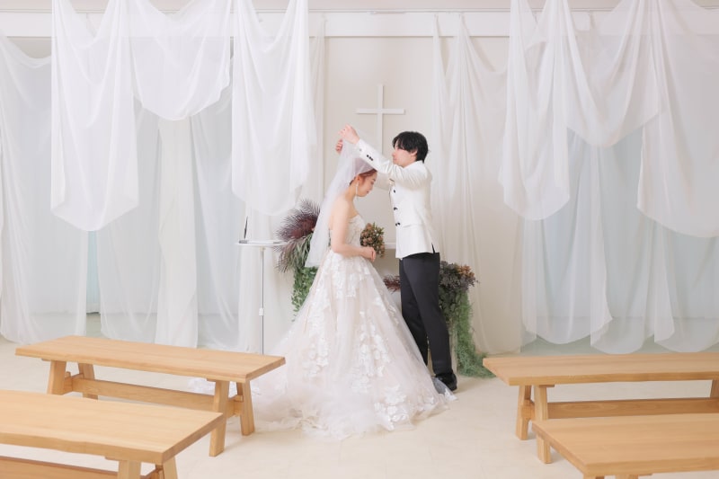 白い壁と天井から下がる布が特徴のチャペルスタジオで、厳かな雰囲気の中、誓いのキスやベールアップなど、挙式の流れを再現しながら撮影ができます。期間限定で、チャペルスタジオでの撮影が無料でハウススタジオに追加可能です。