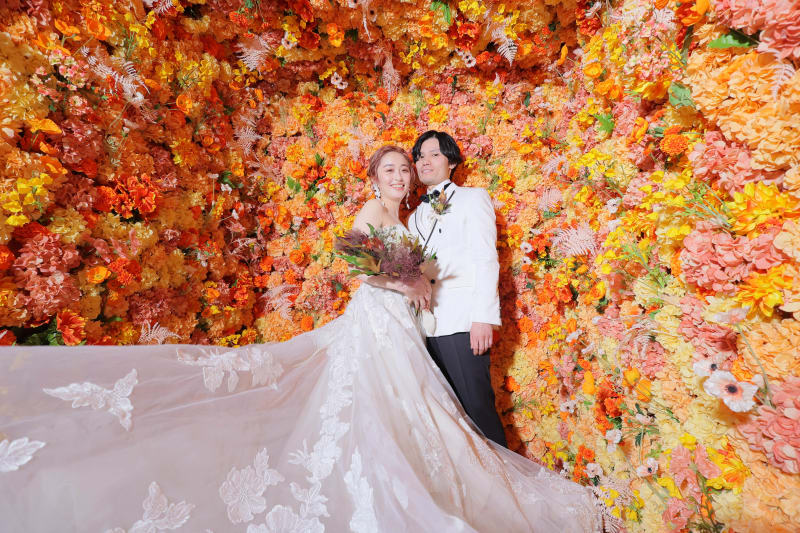 色とりどりの花々が壁一面に広がり、ロマンチックな雰囲気を演出します。写真に華やかさをプラスし、夢のようなひと時を過ごせます。