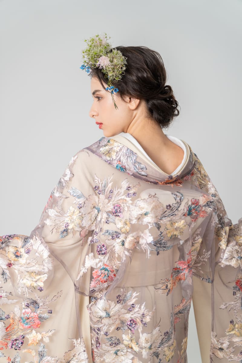 こちらの打掛は、グレーカラーの透け感のあるレースが特徴で、白やクリーム、サーモンピンクのお花が華やかな印象を与えてくれる一着です。