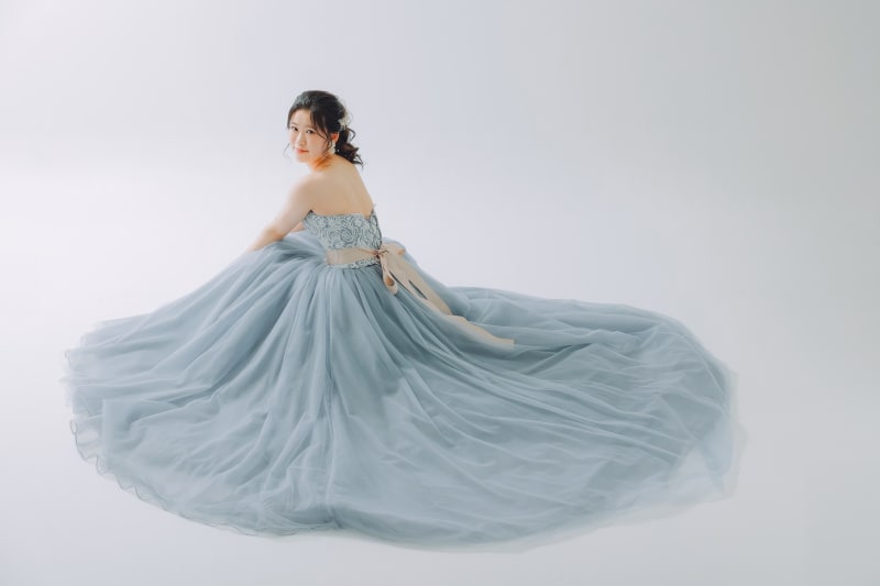 色味もくすんだ水色になっているので落ち着きがあり上品さを兼ね備えています。可愛いけれど可愛らしすぎないドレスです!
