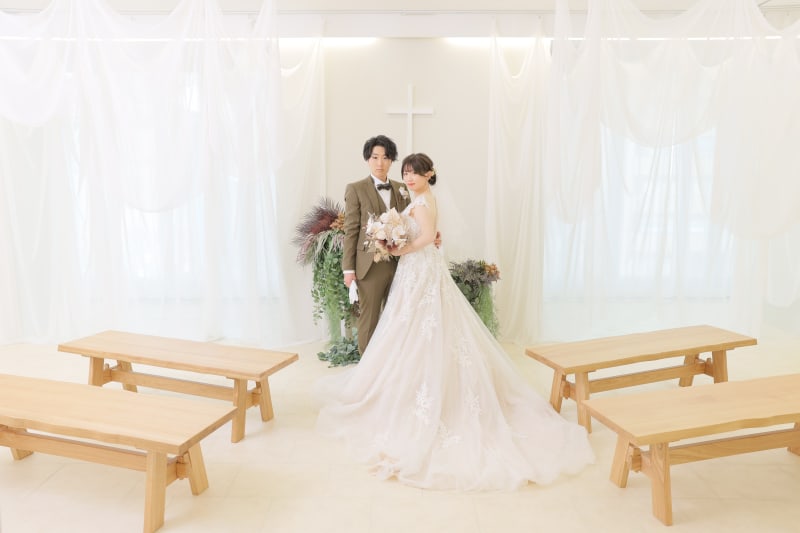 チャペルスタジオでは挙式風シーン、ハウススタジオではカジュアルフォトと、