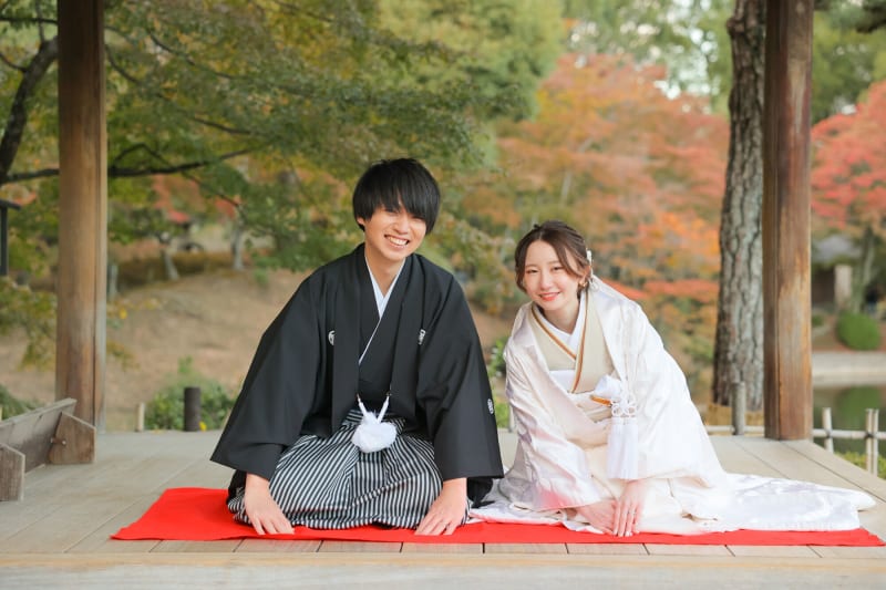 和装では、日本庭園で紅葉を背景に撮影することができ大満足の一日となりました!!