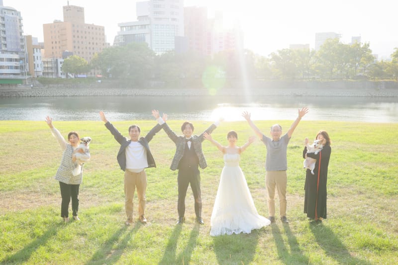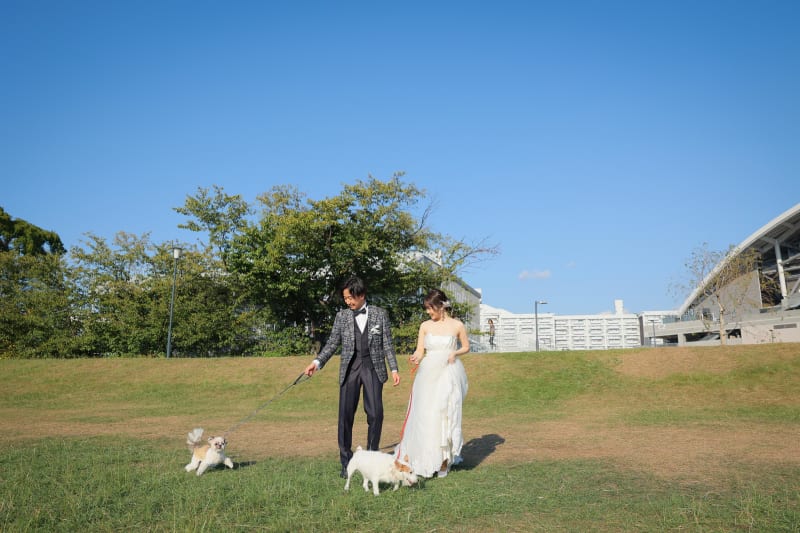 ワンちゃんと一緒に紡ぐ家族の絆 - ひろしまスタジアムパークでの心温まるウェディングフォト