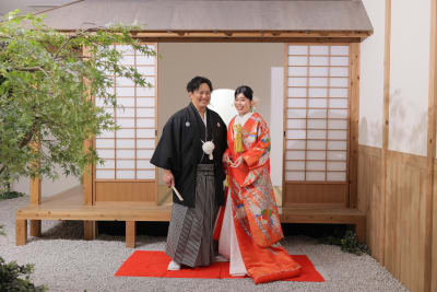 安心の屋内庭園スタジオで、結婚式直前のウェディングフォト