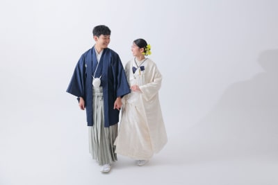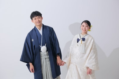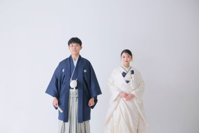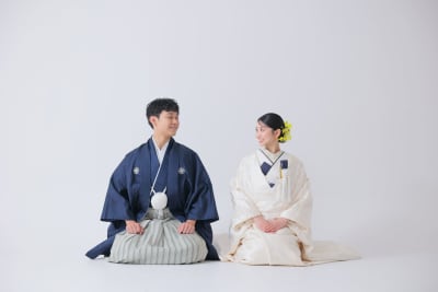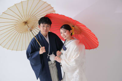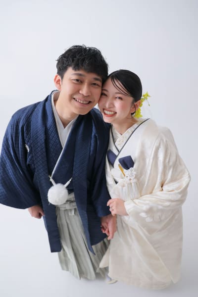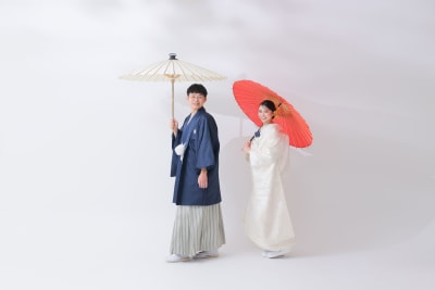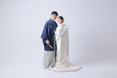 無地の背景が衣装の美しさを引き立て、シンプルだからこそ衣装とおふたりの個性が際立つ写真になりました。