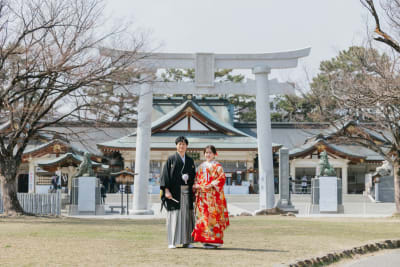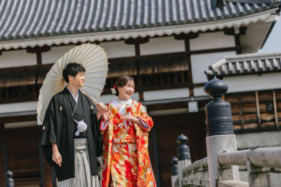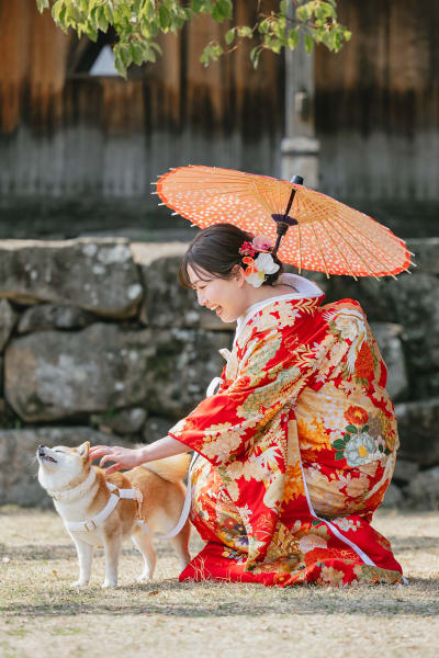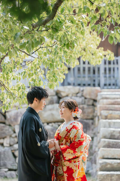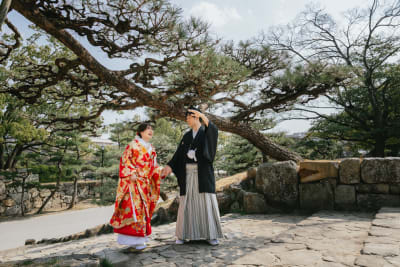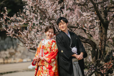 撮影にはご実家のご両親も愛犬と一緒に参加され、春の暖かな陽気の中、和気あいあいとした雰囲気で進めることができました。梅の花が美しく咲くこの季節、広島城の歴史ある背景と相まって、まるでおとぎ話のような1日をお二人とご家族で楽しんでいただけたかと思います。
