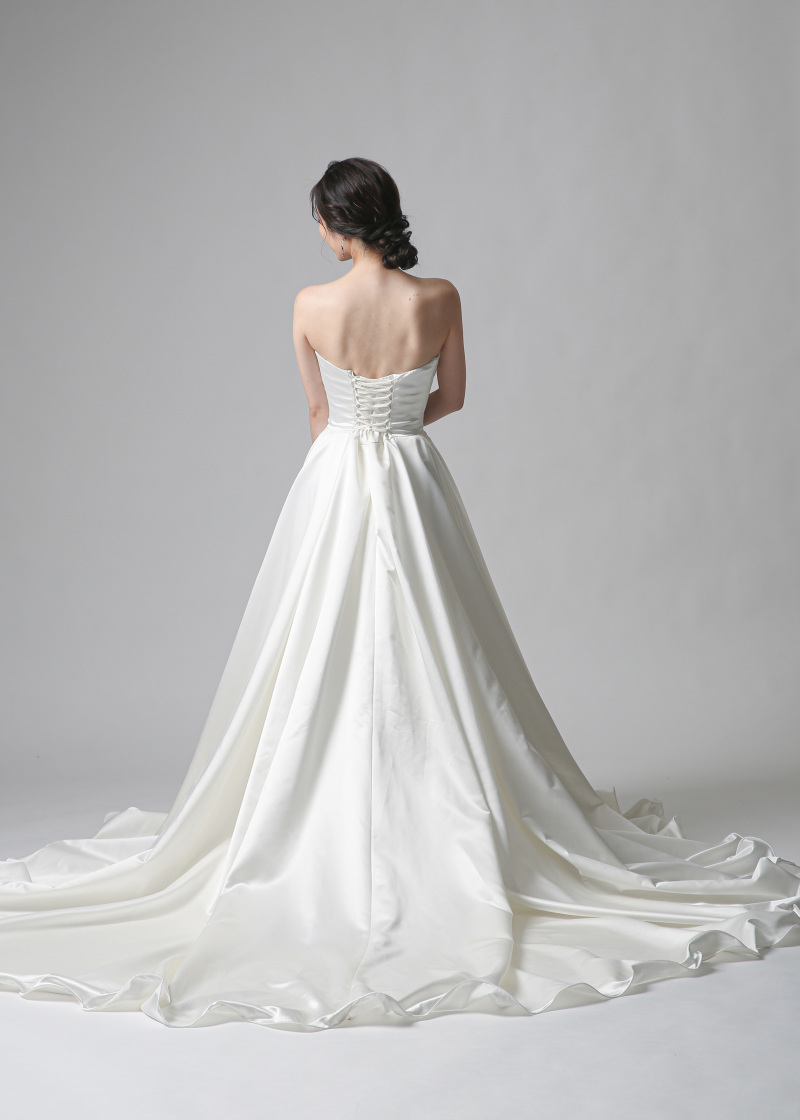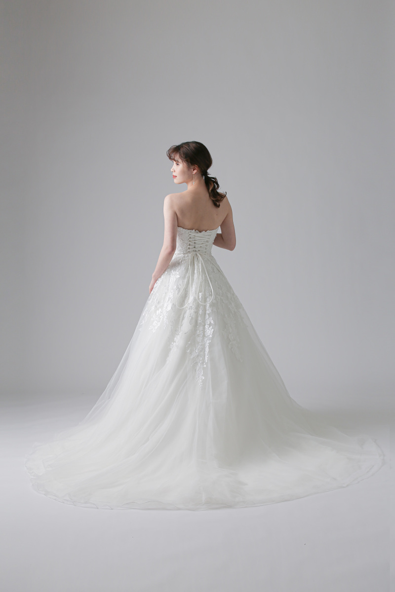 トレーン部分の布の重なりが後ろ姿も華やかに魅せてくれます。
