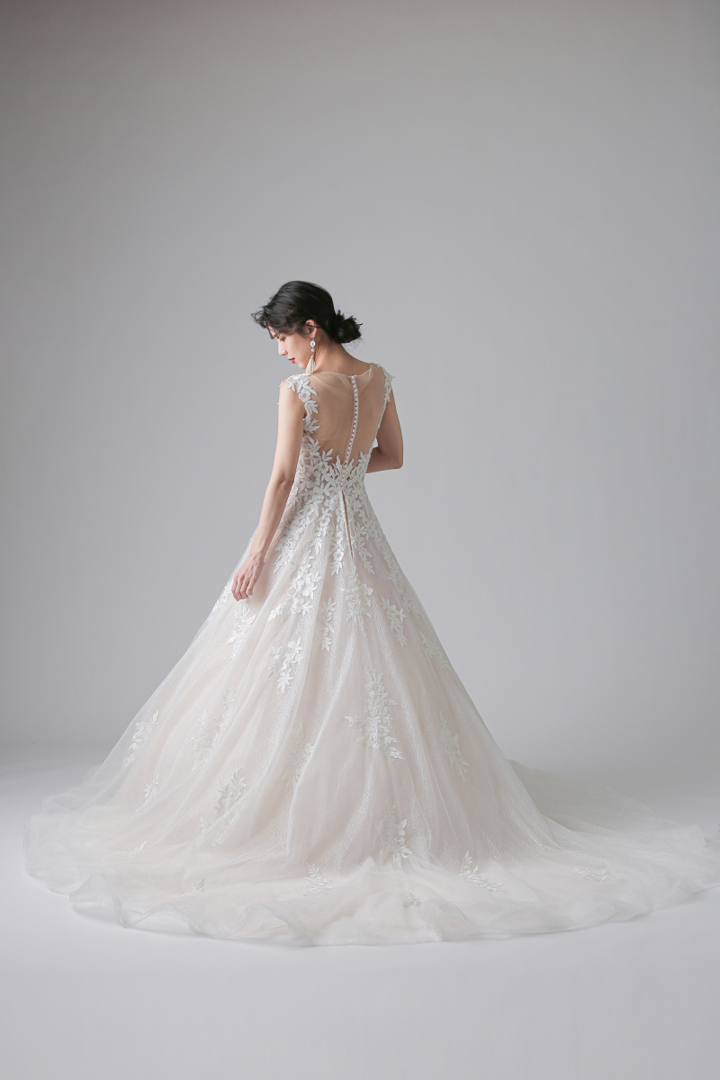ウェディングドレスの中でも王道で、幅広い世代の方に好まれるAラインのドレスとなっております!胸元から広がる刺繍と、その上から施されたスパンコールがとても華やかに映ります。