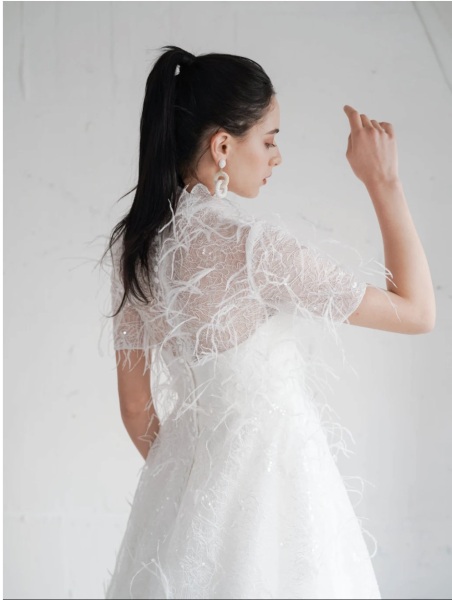 全体に施された羽とスパンコールが柔らかく清楚なイメージに。
