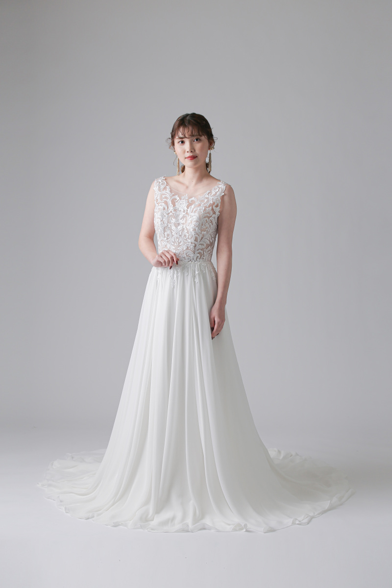 スタイリッシュな雰囲気を持つスレンダーラインで、且つ、胸元の刺繍が可憐さを残すドレスとなっております。