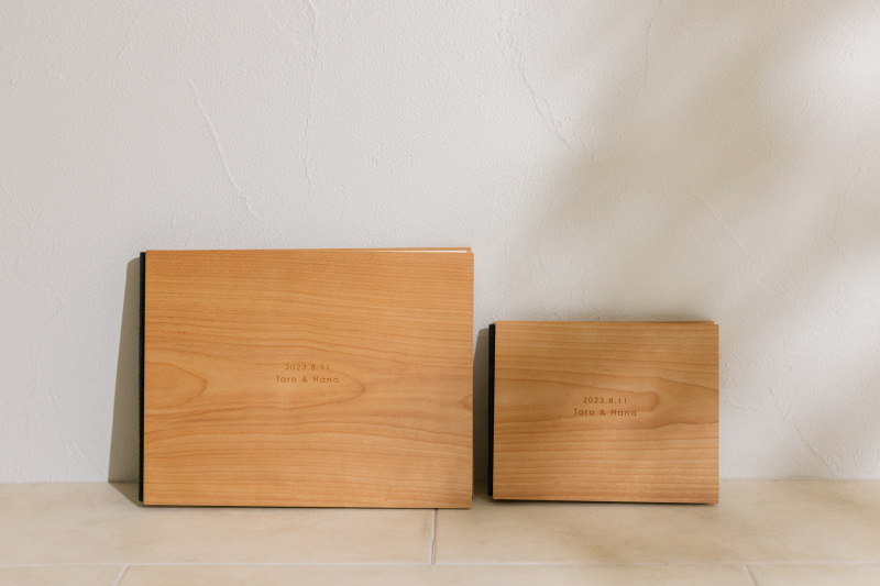 木の表紙が特徴のこのアルバムは、家などでインテリアとしても飾れるため、多くの方からお選びいただいております。