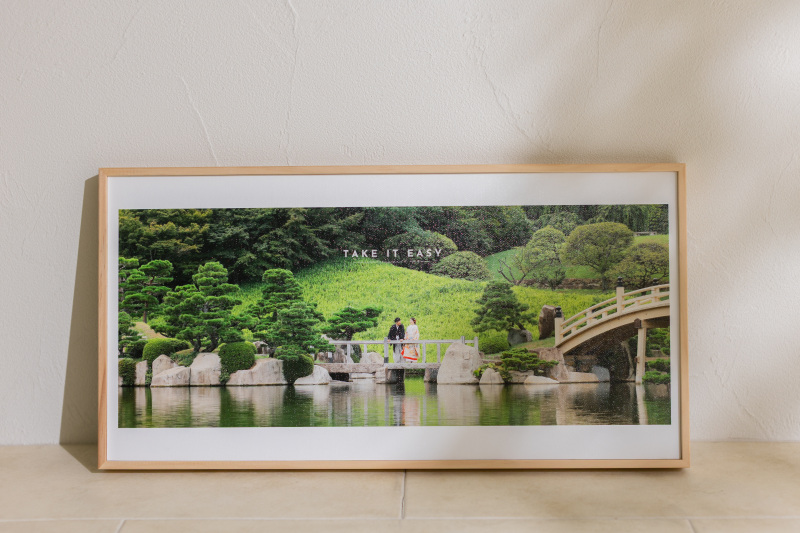 この大きなサイズだからこそ、まるで映画のワンシーンのように、背景の素敵な風景を存分に楽しんでいただけます。天然木のフレームが、写真の美しさを優しく包み込みます。リビングや広い壁に飾れば、お二人の思い出がお部屋の主役になること間違いなしです!