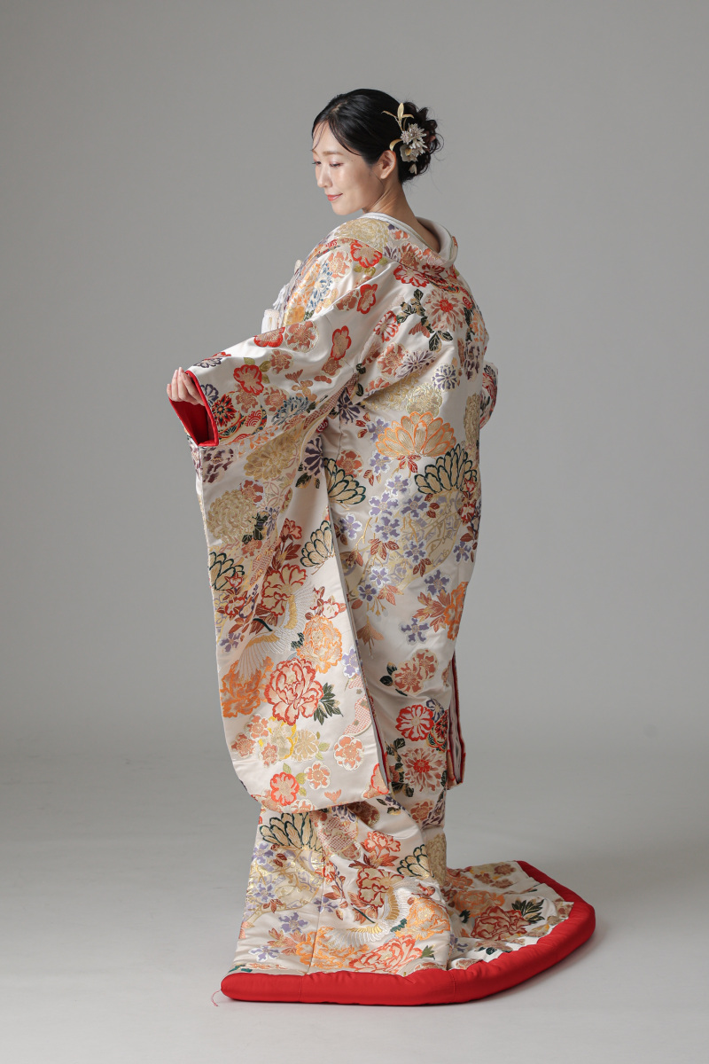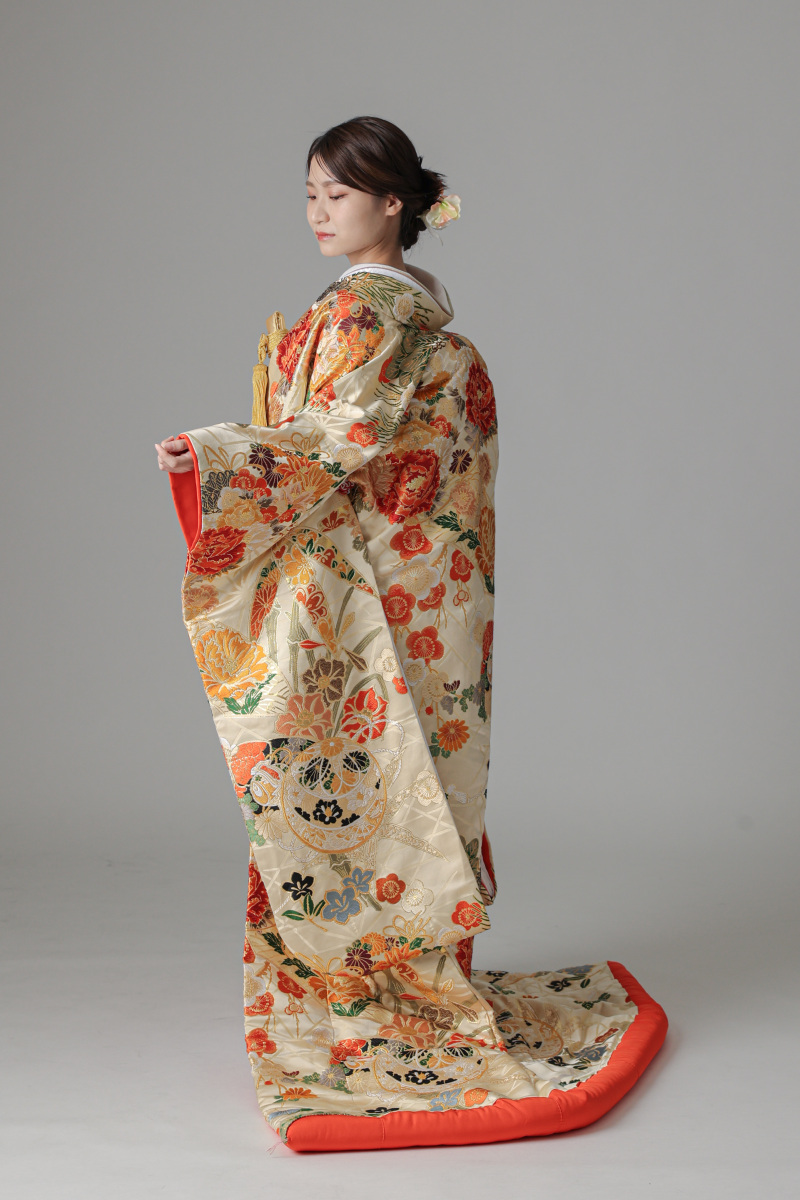 クリーム色を基調とした柔らかさのある色味とトレンド感を感じさせる色打掛。