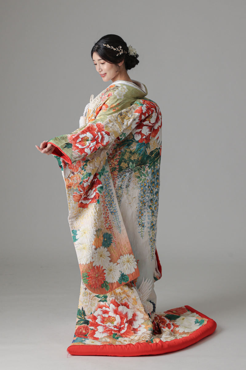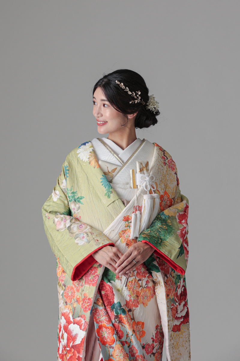 選ぶ色によって印象がガラッと変わる色打掛は、白無垢と一緒にご試着されるお客様が多いです