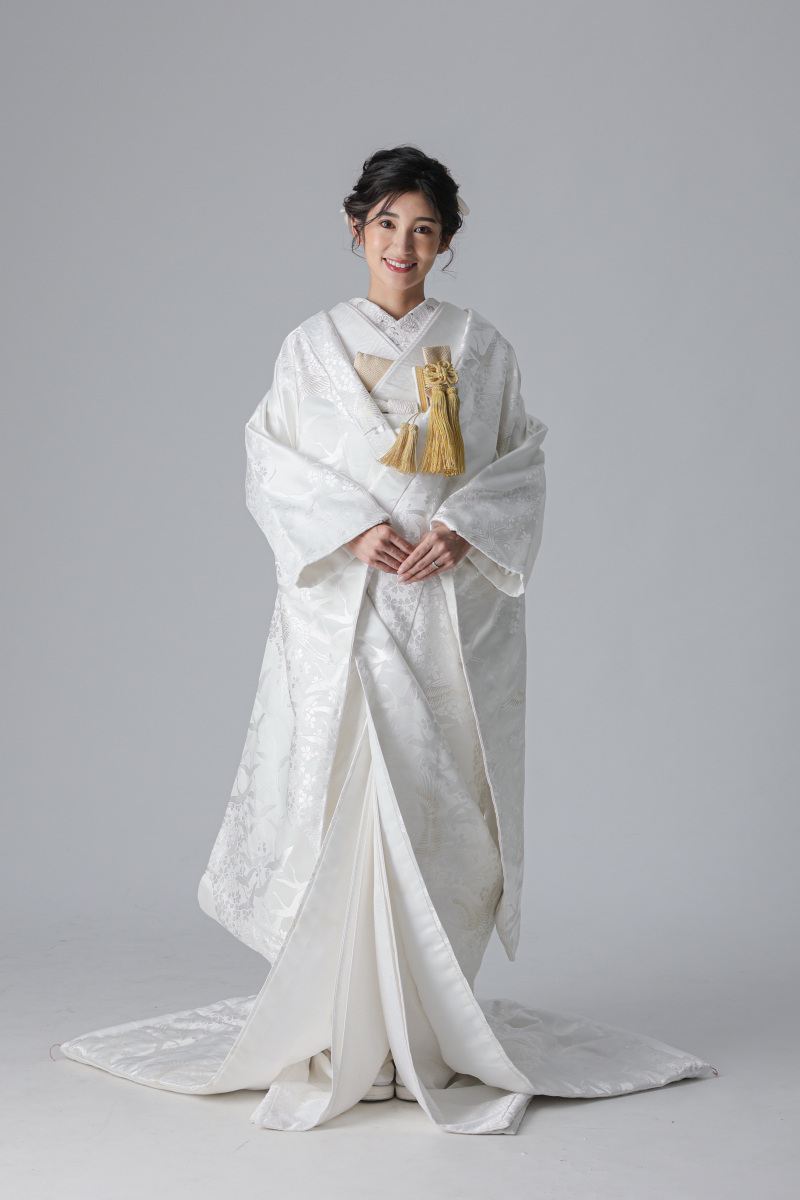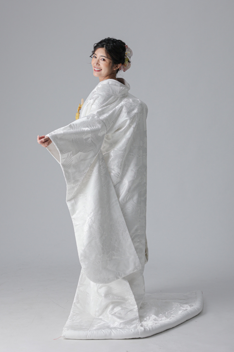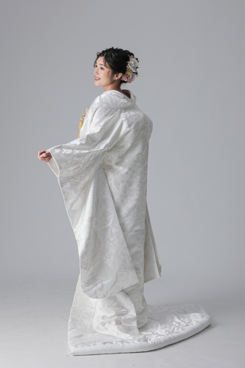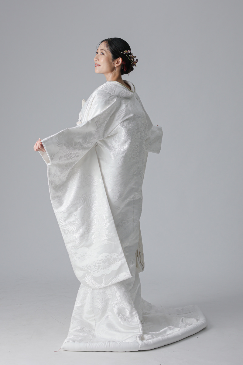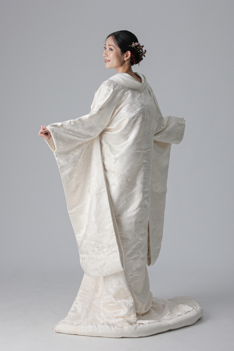 背中には、長寿と夫婦円満を願う鶴の文様が大きく配されているのが特徴の衣装。