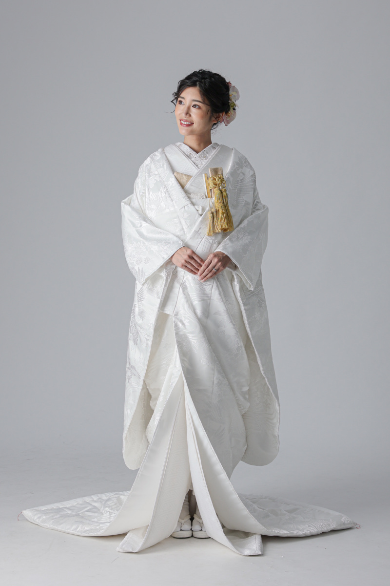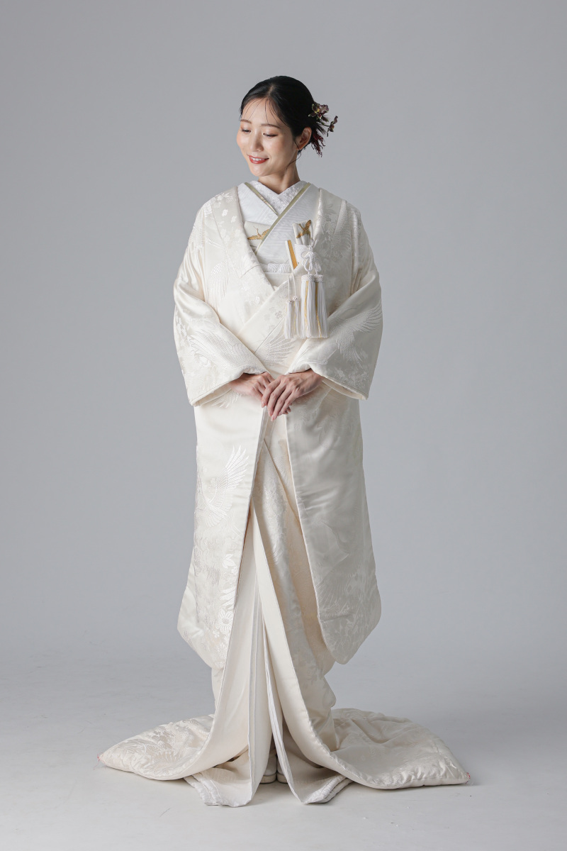 背中には、長寿と夫婦円満を願う鶴の文様が大きく配されているのが特徴の衣装。