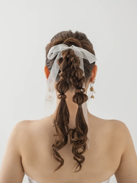 高い位置から結び、毛束をいくつかに分けてふっくらと引き出した「バブルヘア」や「玉ねぎヘア」のような要素を取り入れたツインポニーテール。