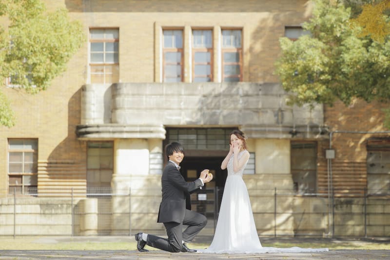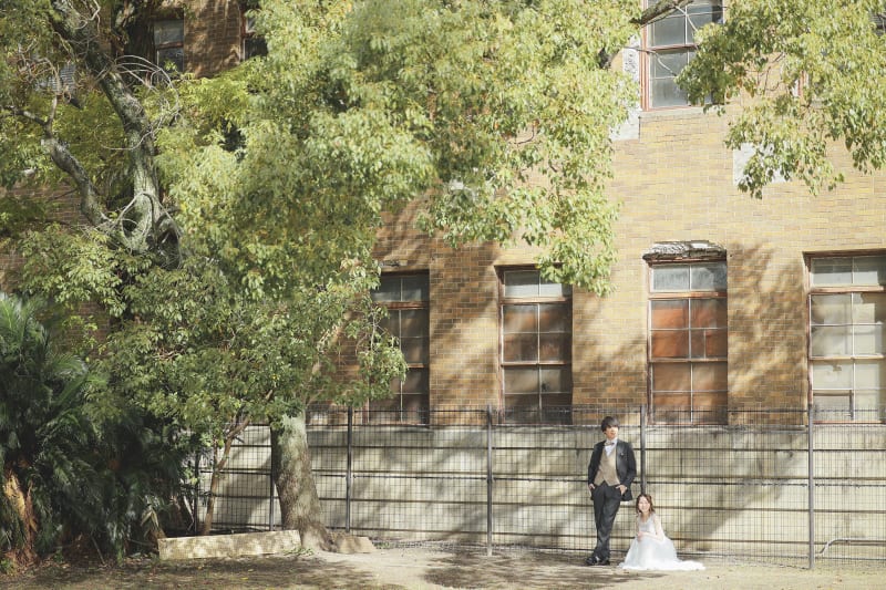 この日は、奇跡的にも晴天の恵まれたので、たくさんの木々が太陽の光に照らされてまるでおふたりの幸せを包み込むようでとてもいい感じでした!また、建物の前での撮影では、建物が古いことから違った雰囲気と味が出ること間違いなしです♪