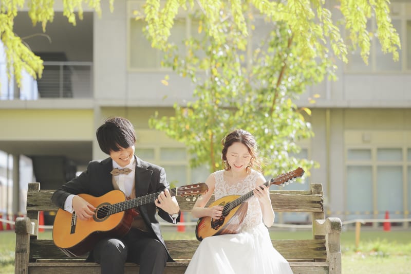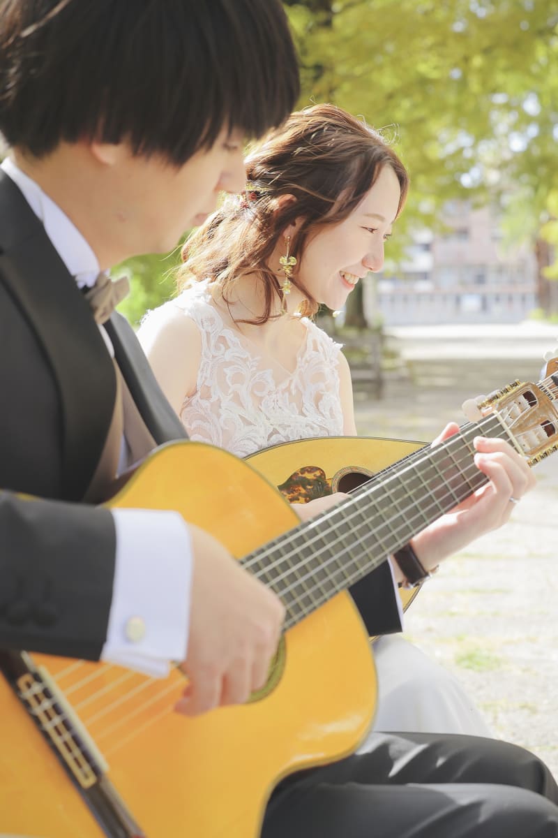 屋外の自然の中でお二人が弾くギターの音色がまるで幸せを運んでくれているかのようですよね🎶
