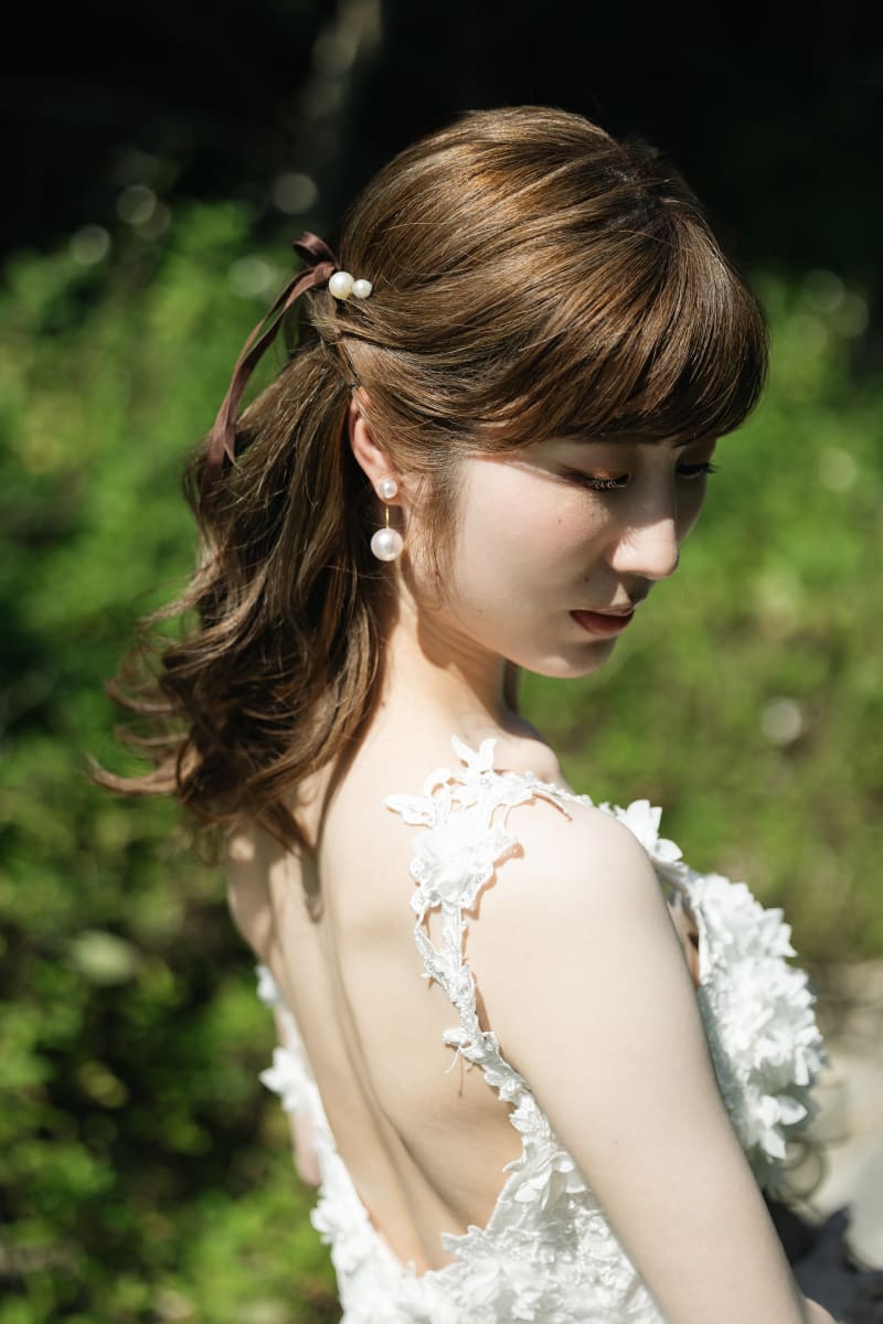 イヤリングに合わせたパールと落ち着いたブラウンの