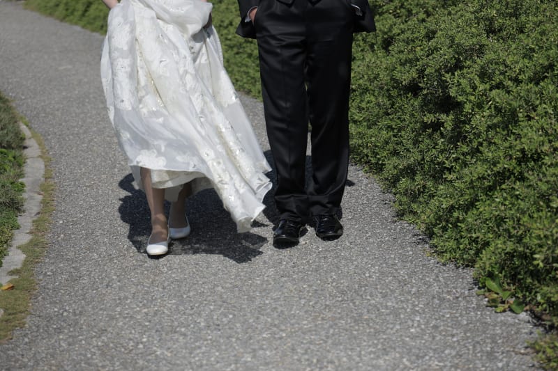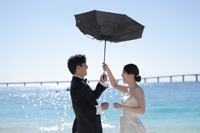 さりげない新郎様の優しさ、傘をさして新婦様も笑顔でカメラを見てくれました。