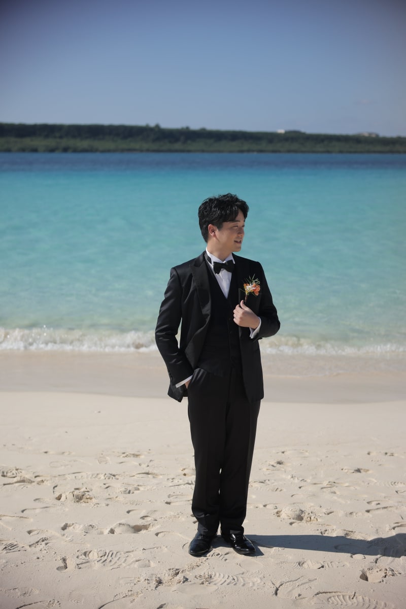 新郎様も同じ色のブートニアを胸につけてのソロカット。