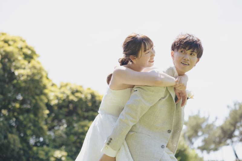 新郎さんが新婦さんをおんぶして見つめ合いショット