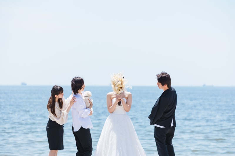 新婦さんはブーケでお顔を隠してご家族の皆様は新婦さんを覗き込むようなお写真!!
