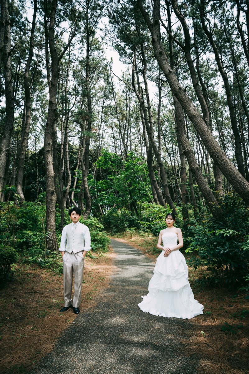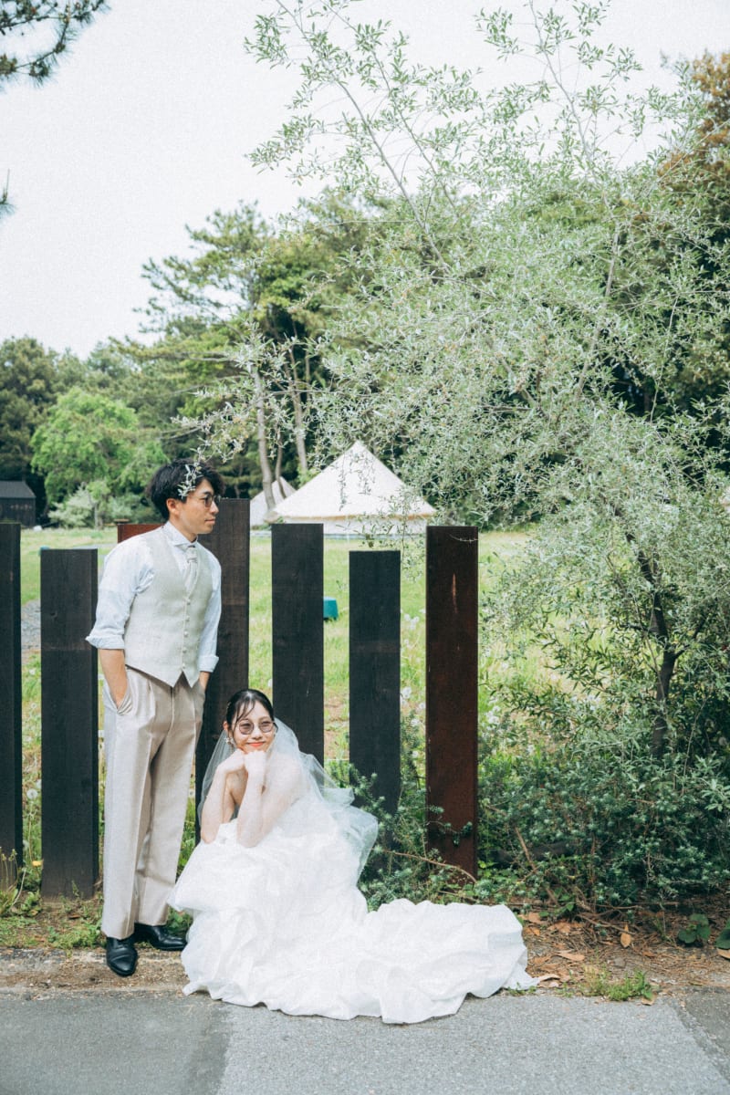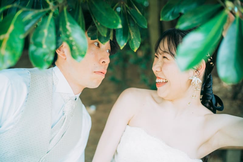サングラスでカッコよく!海とは雰囲気が変わって緑や自然がいっぱいある場所でのお写真♪サングラスをつけてカッコ良いお二人です!