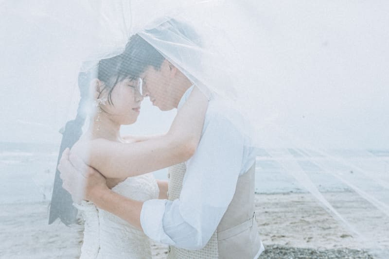 ベールに包まれたお二人。海をバックに撮ったこちらのお写真はとてもお洒落な雰囲気となりました!