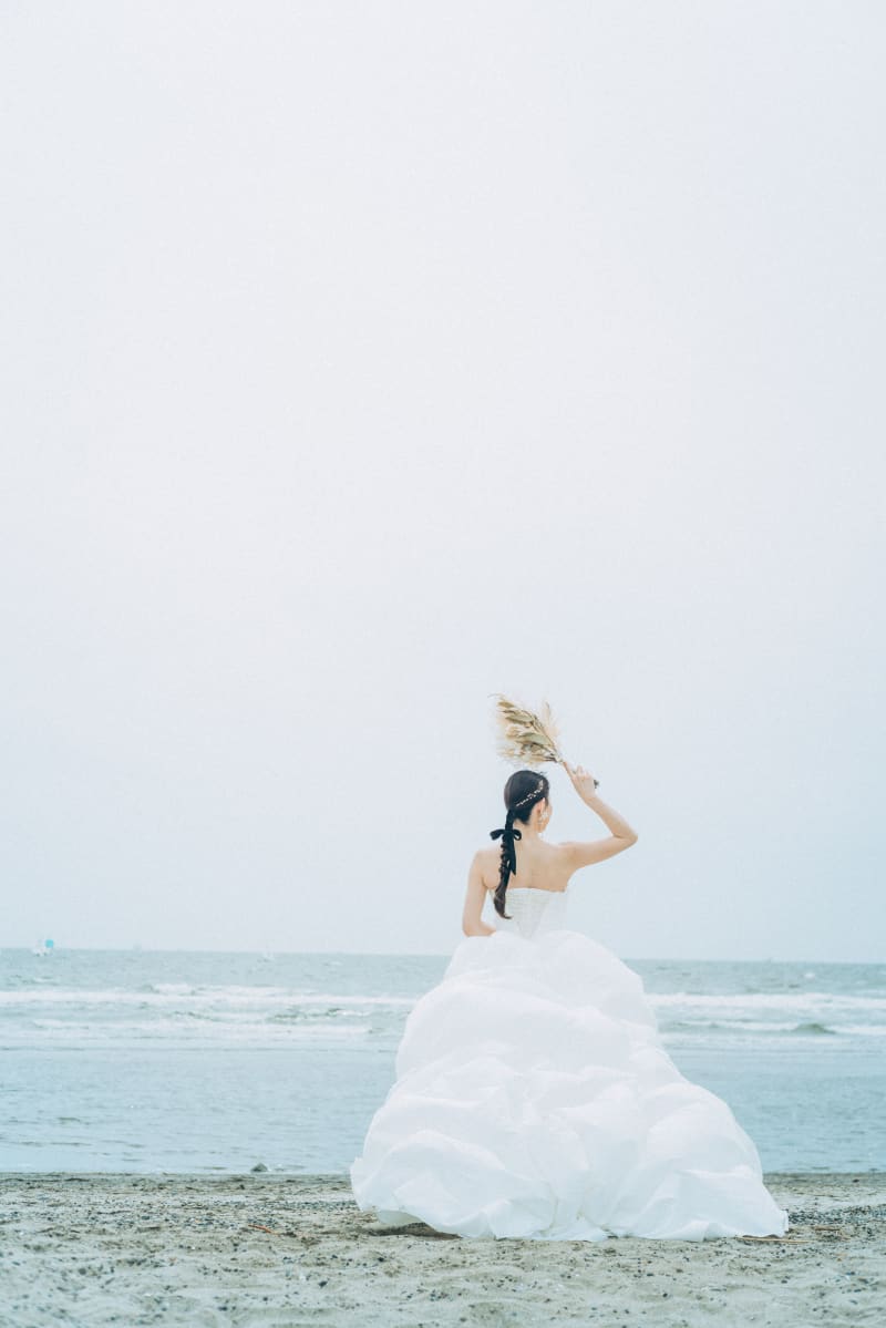 ご新婦様ソロショット。海を背景に撮ったこちらのお写真は、ブーケも合わさって髪型もドレスもとても素敵です!