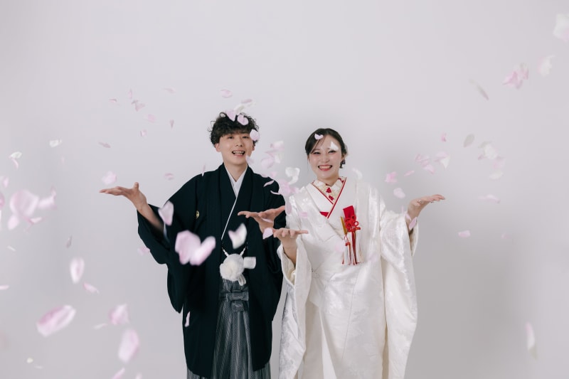たくさんの花びらに囲まれたフラワーシャワーのショットです!