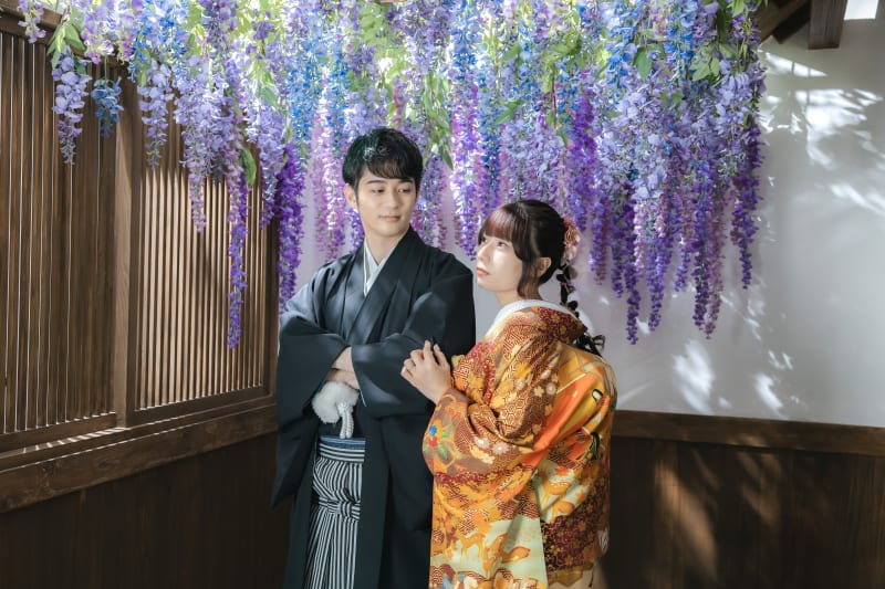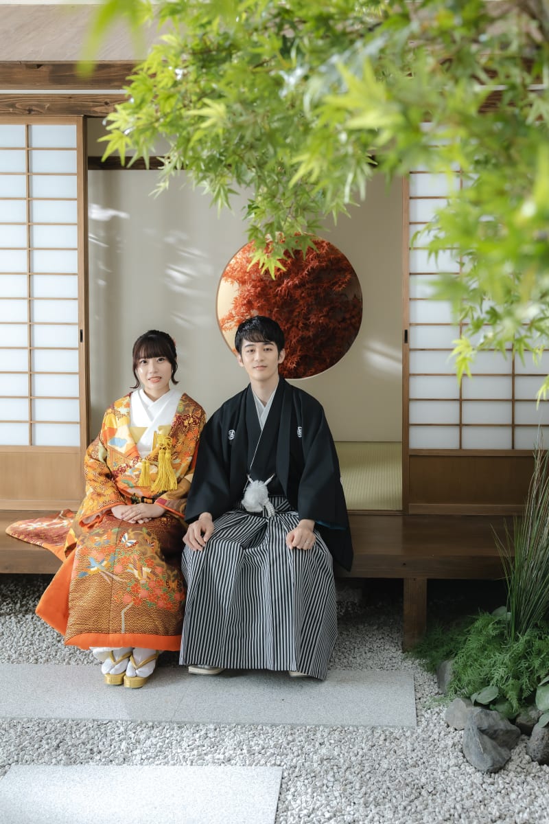 まずは和装で屋内庭園。お二人の見つめ合いです!